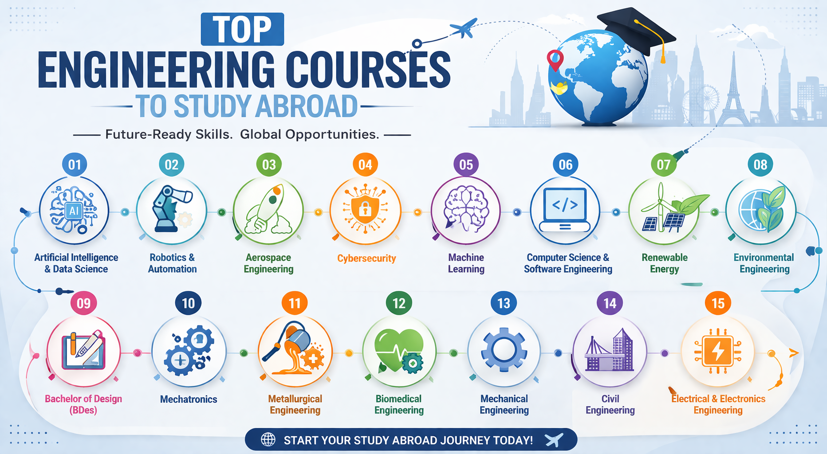 Engineering remains one of the most preferred choices for students planning to study abroad, owing to its global relevance, innovation-driven nature, and strong employability outcomes. With rapid advancements in technology and infrastructure worldwide, engineering graduates are in high demand across multiple industries. Studying abroad not only offers access to advanced facilities and research opportunities but also equips students with international exposure and cross-cultural skills that are highly valued by employers.
